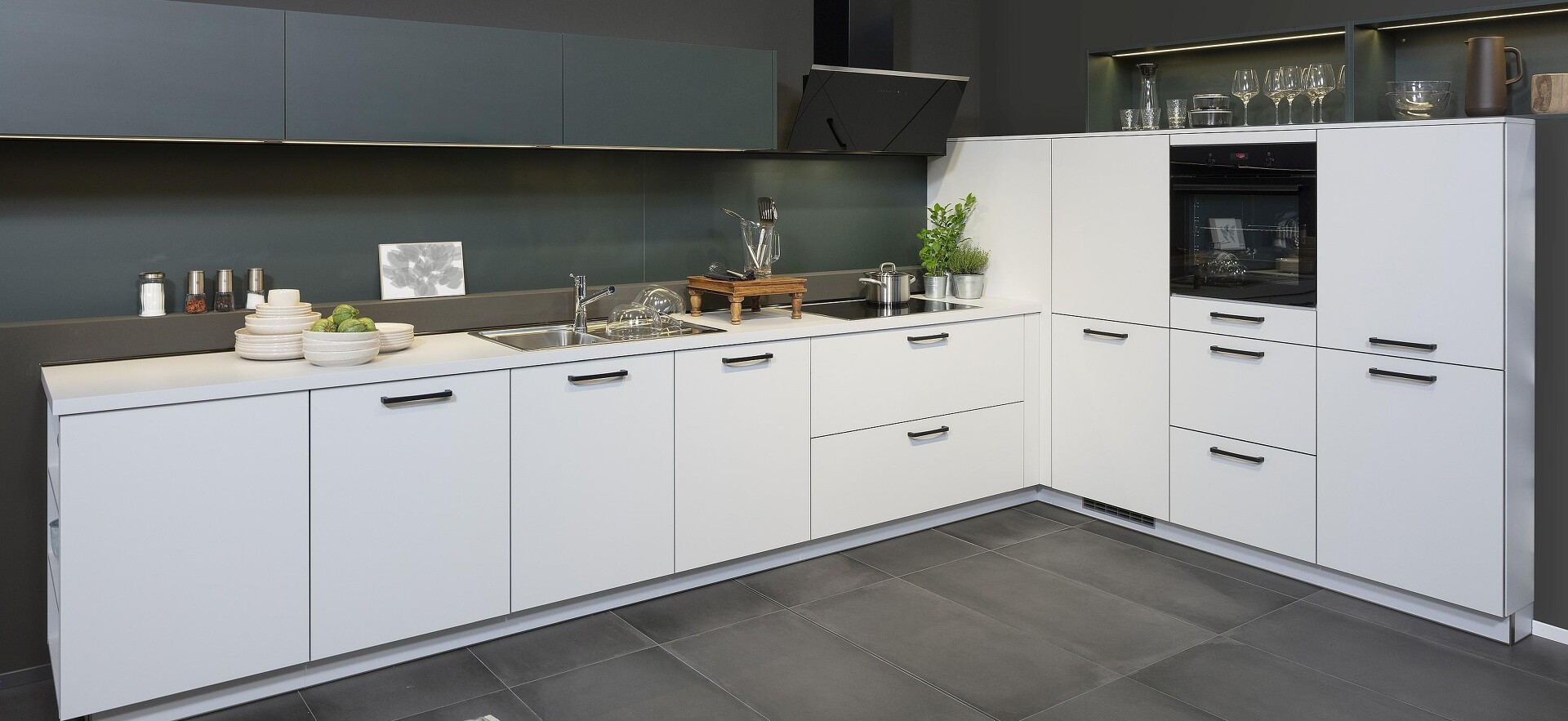 Ohne Oberschränke sehen Küchen ja gleich umso wohnlicher aus, aber meistens kann man wegen Stauraummangel schlichtweg nicht darauf verzichten. Was Sie aber tun können, ist, die Oberschränke optisch zu verbergen. Das Küchenbeispiel zeigt, wie's geht: Mit einer zweifarbigen Gestaltung, bei der die Unterschränke am besten in Weiß und die Oberschränke in einem sehr dunklen Farbton und ohne Griffe gestaltet sind. In diesem Fall handelt es sich um die neue Farbe Blackgreen. Der entscheidende Clou ist natürlich, dass die Wand dahinter in genau derselben Farbe gestrichen ist. Dadurch verschwinden die Oberschränke beinahe im Hintergrund. Der Effekt ist frappierend, oder nicht?!